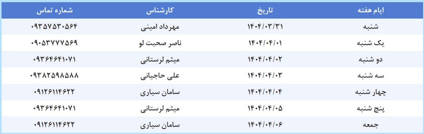ساعت کاری کارشناسان کشیک در طول هفته از ساعت 18:00 و پنج شنبه ها از ساعت 13:30 آغاز می گردد.
